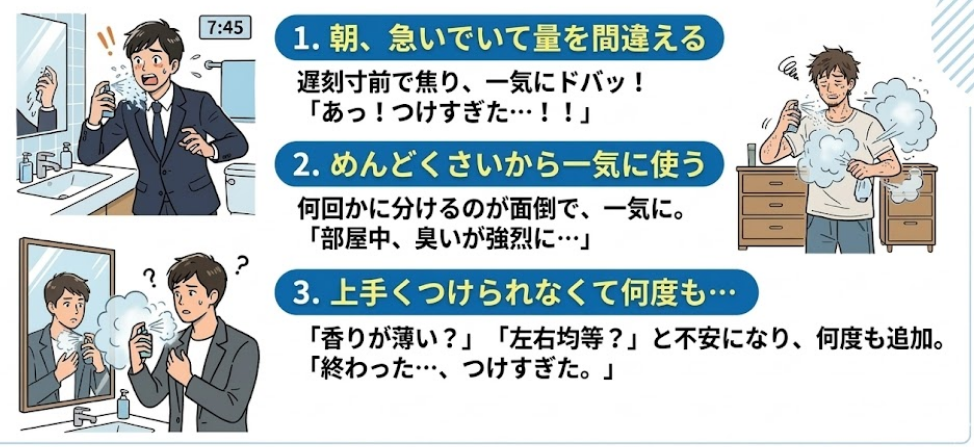 男性だと以下のように香水を付けすぎて後悔した経験があるはずです。