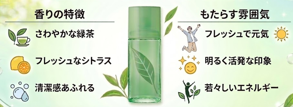 名前の通り「緑茶」をベースにした香水で、さわやかで清潔感のある香りだからです。