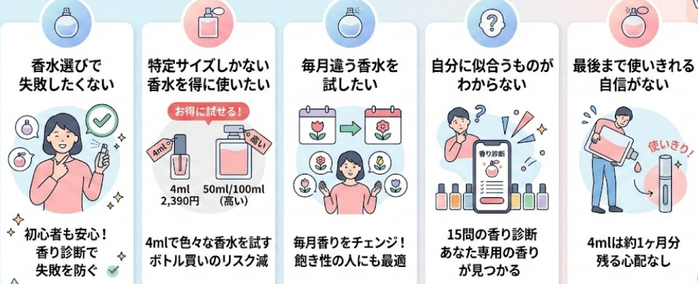 とくに「すぐ香水に飽きてしまう」「もっと色んなものを知りたい」なら、相性抜群です。